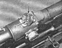 На прицелах ПБ (фото 90, 91) горизонтальное выведение центра зрительного поля на цель производится вращением винта 2 (фото 90) и 3 (фото 91), перемещением прицела по горизонтальной направляющей кронштейна. По вертикали зрительное поле в данном прицеле не наводится по причине очень точной посадки его в клиновидном "ласточкином хвосте", а производится лишь незначительная корректировка дистанционным маховиком вверх-вниз в процессе пристрелки.
