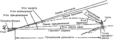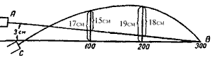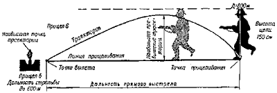 Схема 100. Превышения траектории над линиями прицеливании оптического (АВ) и открытого (СВ) прицелов