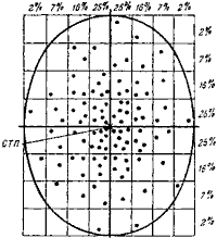 Допустим, что при приведении снайперской винтовки с оптическим прицелом к нормальному бою СТП оказалась на 13 см ниже и на 8 см левее контрольной точки. Для того чтобы ввести поправки в установки оптического прицела, находим в таблице отклонения, равные или близкие полученным при стрельбе Такими отклонениями будут 12 1/2 см по высоте и 7 1/2 см по боковому направлению. Поскольку СТП в данном случае ниже контрольной точки, то против 12 1/2 в графе "СТП ниже" имеем деление 4 1/4, а против 7 1/2 в графе "СТП влево" - деление +3/4.