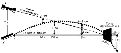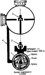 Винтовку зажимают в пристрелочном станке (или просто струбциной крепят на чем-нибудь массивном) и при извлеченном затворе наводят по каналу ствола на мишень, расположенную на дистанции 100 метров от стрелка. Если конструкция ствольной коробки не позволяет заглянуть внутрь ствола, для этой цели используют продолговатый осколок зеркала. Мишень должна виднеться строго посреди круглого поля канала ствола, по его оси (1 на схеме 94). Не сбивая этой наводки и постоянно сверяясь с ней, устанавливают открытый прицел, подбивая высоту мушки (вывинчивая или ввинчивая ее, или же меняя мушки по номерам, или же обрабатывая их надфилем) и смещая ее по горизонту. Открытый прицел устанавливается так, чтобы его точка прицеливания была в центре той же самой мишени с установкой прицела "1" (2 на схеме 94). Постоянно сверяясь уже с этими двумя наводками, нити или прицельную сетку оптического прицела выводят в ту же самую точку прицеливания в центре мишени (3 на схеме 94). По окончании этого процесса СТП будет находиться вблизи этой точки прицеливания, общей и для открытого, и для оптического прицелов. Для охотничьих целей этого вполне достаточно.
