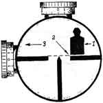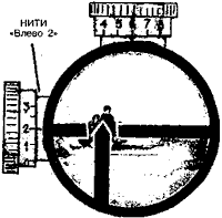 Почему нужно, чтобы центр прицельного перекрестия был в центре зрительного поля, а не где-то с краю? Потому что, во-первых, четкость изображения цели в центре зрительного поля будет намного выше, чем по краям. Во-вторых, если перекрестие расположено в центре поля, можно крутить поправки в любую сторону и перемещать прицельное перекрестие туда, куда надо. Для иллюстрации посмотрите на схему 95. При стрельбе по движущейся цели для упреждения надо дать поправку (в данном случае) вправо "2", чтобы ствол оружия тоже пошел вправо и пуля с упреждением встретила цель. Для этого нити надо переместить влево, но, поскольку они уже там находятся, влево их перемещать уже некуда.