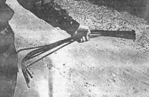 Для обустройства удобной и надежной позиции во время Второй мировой войны и русскими, и немцами часто применялся (иногда применяется и сейчас) так называемый "камуфляжный пень" (фото 180, 181). Такой пень делается из подручных материалов. Обычно за основу берут старую автомобильную покрышку, какие в изобилии валяются по дорогам, обрезают борта и вокруг нашивают бересту или другую древесную кору. Бывало, что с двух сторон такого "пня" крепили кору разных пород деревьев, чтобы удобно и быстро было маскироваться в разных условиях и в разных местах. Маскировочный пень ставится опять же на окоп, грунт рядом с которым присыпается листьями, травой и т. д. по условиям местности. Иногда умельцы между резиновой основой и корой привинчивали болтами обломки рессор из разбитой техники или другие толстые металлические пластины. Пень превращался в дот, защищая хозяина от пуль и осколков. Интересно, что пули пробивали стальную неподвижную плиту и не пробивали небольшие стальные пластины той же толщины, амортизирующие на резиновой основе. Бывало, что противник на всякий случай пристреливался по пням в зоне своего контроля, после чего успокаивался и на проверенный таким образом пень более не обращал внимания.