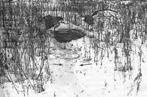 Поэтому наряду с основной позицией снайпер оборудует запасные позиции, на которые перемещается в случае опасности. Но это еще не все. Внимание противника надо рассеять, надо ввести его в заблуждение, поэтому наряду с позициями основными и запасными снайпер оборудует позиции ложные, лишь слегка замаскированные, на которых часто располагает чучела-приманки или примитивные манекены. К тому же снайперы определяют позиции подскока, на которые выдвигаются для одного-единственного выстрела и сразу же покидают их (фото 186).