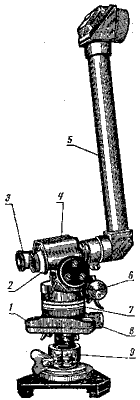 Схема 104. Буссоль 1 - ориентир-буссоль, 2 - привод механизма вертикальной наводки; 3 - окуляр; 4 - оптический визир, 5 - зеркальный перископ, 6 - привод механизма горизонтальной наводки; 7 - шкала; 8 - ориентирующий червяк, 9 - шаровая пята
