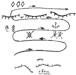 Сектор наблюдения разбивается на зоны или полосы по принципу отдаленности от своего переднего края. Обычно ширина этих полос составляет 200 метров. Последовательность просматривания местности проводится "челночным" образом (схема 105), начиная "от себя".