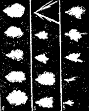 Скорость горения бездымного пороха и качество выстрела в большой мере зависят от качества срабатывания капсюля. Капсюль должен образовывать факел пламени определенной длины, температуры и продолжительности действия. Эти качества объединяют термином "форс пламени". Но капсюли, даже очень хорошего качества, могут не дать необходимого форса пламени при плохом ударе бойка. Для полноценной вспышки энергия удара должна быть 0,14 кг м. Такую энергию имеют ударные механизмы современных снайперских винтовок. Но для полноценного воспламенения боевого вещества капсюля имеют значение также форма и величина бойка. При нормальном бойке и сильной боевой пружине вычищенного ударного механизма форс пламени капсюля постоянный и обеспечивает стабильное воспламенение порохового заряда. При заржавленном, загрязненном, изношенном спусковом механизме энергия удара по капсюлю будет различной, при загрязнениях выход бойка для удара будет мал, следовательно, форс пламени будет различным (схема 110), сгорание пороха будет неоднообразным, давление в стволе от выстрела к выстрелу будет меняться (больше - меньше - больше), и не удивляйтесь, если нечищеное оружие вдруг будет давать заметные "отрывы" вверх-вниз.