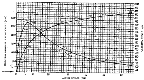 Схема 111. Изменение давления газов и нарастание скорости пули в стволе винтовки образца 1891-1930 гг.