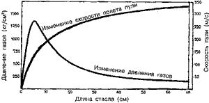 Схема 112. Изменение давления газов и скорости пули в стволе малокалиберной винтовки