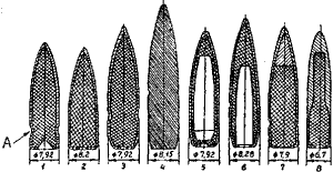 1 - отечественная легкая, 2 - германская легкая; 3 - отечественная тяжелая; 4 - французская сплошная; 5 - отечественная со стальным сердечником; 6 - германская со стальным сердечником; 7 - английская; 8 - японская А - кольцевой желобок - накатка для крепления пули в гильзе