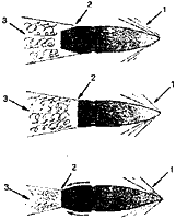 длиннее должна быть ее головная часть. Такое положение продиктовано законами аэродинамики. Вытянутый конический носик пули имеет меньшее аэродинамическое сопротивление при полете в воздухе. Для примера - оживальная тупоконечная пуля трехлинейной винтовки первого образца выпуска до 1908 года давала 42% понижения скорости на пути от 25 до 225 м, а остроконечная образца 1908 г. на том же пути - только 18%. В современных пулях длина головной части пули выбирается в пределах от 2,5 до 3,5 калибра оружия. Ведущей частью пуля врезается в нарезы.
