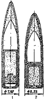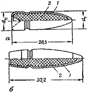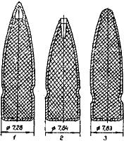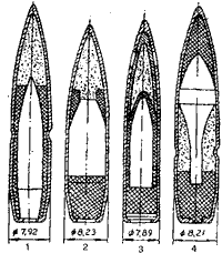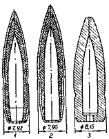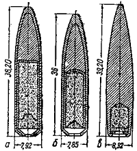 До сих пор в применении встречаются пули старого изготовления. Имеются легкие пули образца 1908 г. с мельхиоровой оболочкой без кольцевой накатки для фиксации пули в гильзе (схема 115) и легкая пуля образца 1908-1930 гг. со сталь-вой, плакированной томпаком оболочкой, имеющая кольцевую накатку для лучшего закрепления пули в дульце гильзы при сборке патрона (А на схеме 114).