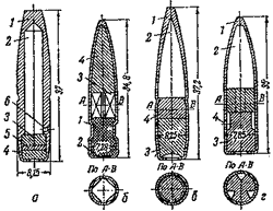а - французская пуля Ph: 1 - оболочка, 2 - фосфор, 3, 4 и 5 - донная часть, 6 - легкоплавкая пробка; б - испанская пуля Р 1 - сердечник, 2 - очко, 3 - тяжелое тело, 4 - зажигательный состав (фосфор); в - германская пуля SPr 1 - оболочка, 2 - зажигательный состав (фосфор), 3 - донная часть; 4 - легкоплавкая пробка; г - английская пуля SA: 1 - оболочка, 2 - зажигательный состав, 3 - донная часть; 4 - легкоплавкая пробка