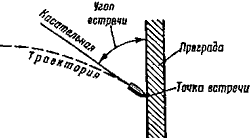 Пробивное действие пули характеризуется глубиной ее проникновения в преграду определенной плотности. Живая сила пули в момент ее встречи с преградой существенно влияет на глубину проникновения. Но кроме этого, пробивное действие пули зависит от ряда других факторов, например, от калибра, веса, формы и конструкции пули, а также от свойств пробиваемой среды и от угла встречи. Углом встречи называется угол между касательной к траектории в точке встречи и касательной к поверхности цели (преграды) в той же точке. Наилучший результат получается при угле встречи, равном 90°. На схеме 129 показан угол встречи для случая вертикальной преграды.